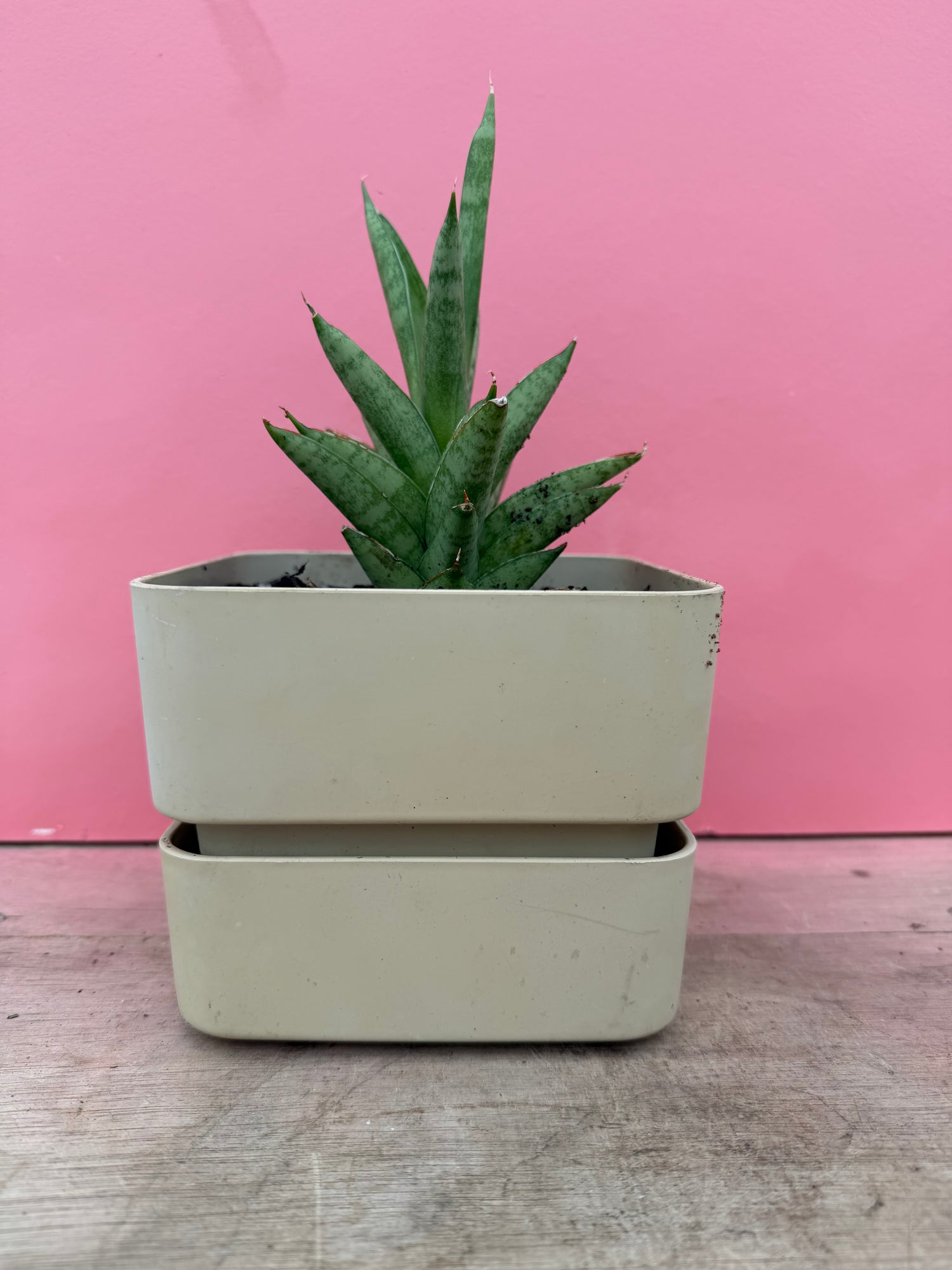 A hardy Sansevieria, aka Snake Plant, in a vintage plastic pot. Beige in colour, the pot comes with matching saucer. There are two available - please see next product listing.
